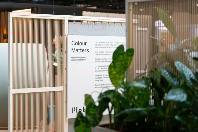 Le stand Colour Matters a été pensé par zones d’usage (concentration, collaboration, détente) où la couleur et les textures orientent naturellement les comportements.
