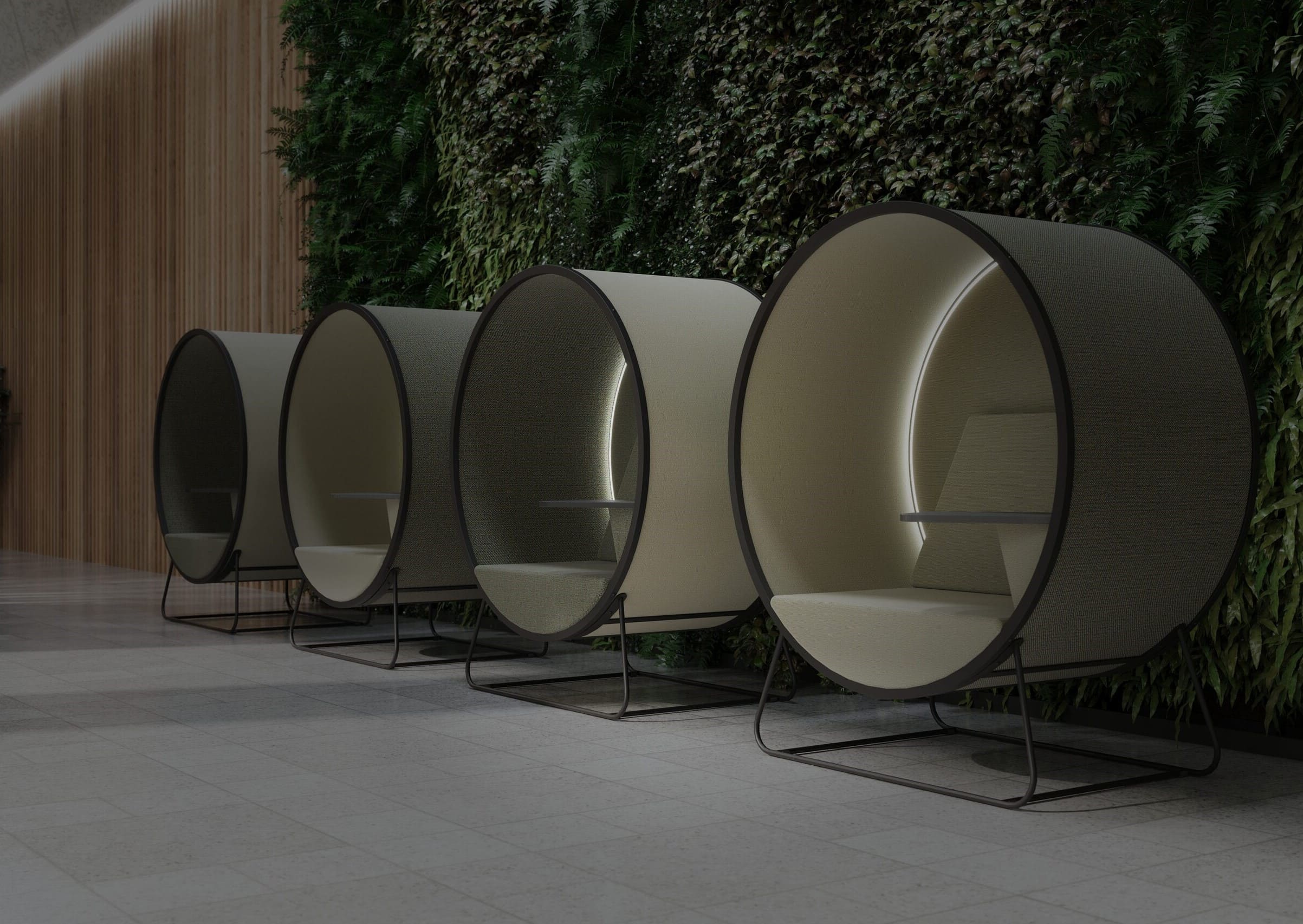 -> Le design du Kuppel de chez CONENCTION réduit les nuisances sonores et visuelles, et son équipement (prise électrique, tablette intégrée) favorise la concentration dans les opens spaces ou les espaces publics.
